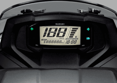Probado y aprobado en la Suzuki Gixxer, se adopta el tablero de instrumentos digital de última generación. La entrega de datos de fácil y rápida lectura es un compromiso de confort y seguridad con el motorista de la motoneta Burgman125 FI.
